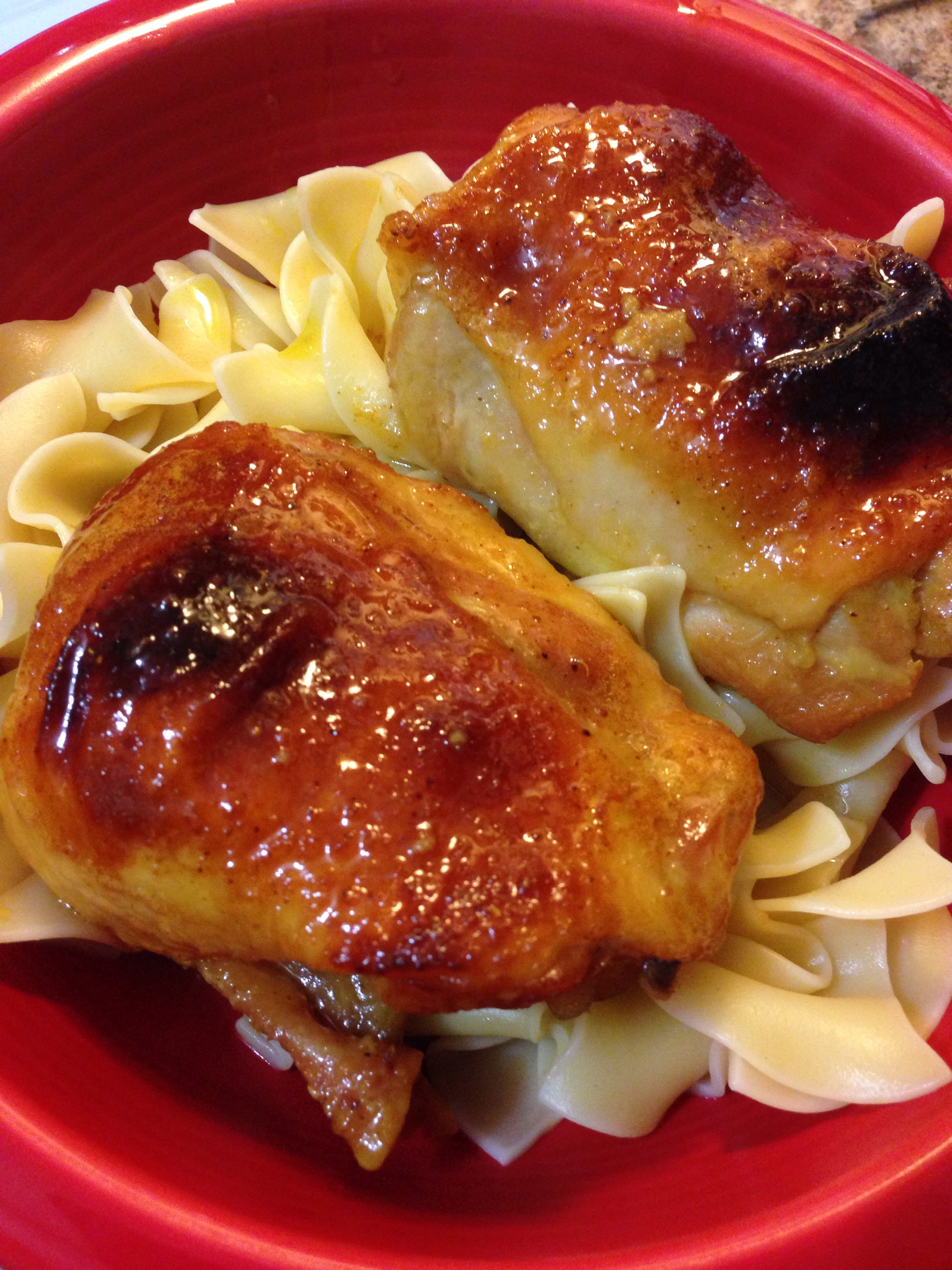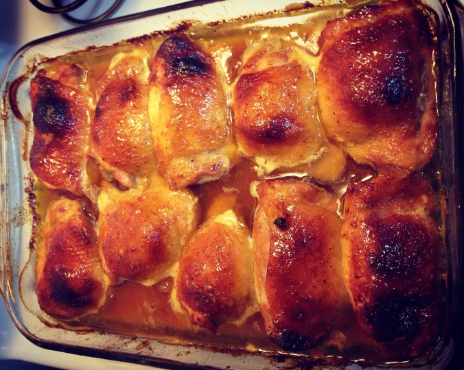4) Bake for 75-90 minutes, basting thighs in mixture every 15 minutes. When skin looks golden and starts to take on a deep brown color on most of the pieces, remove and serve.
